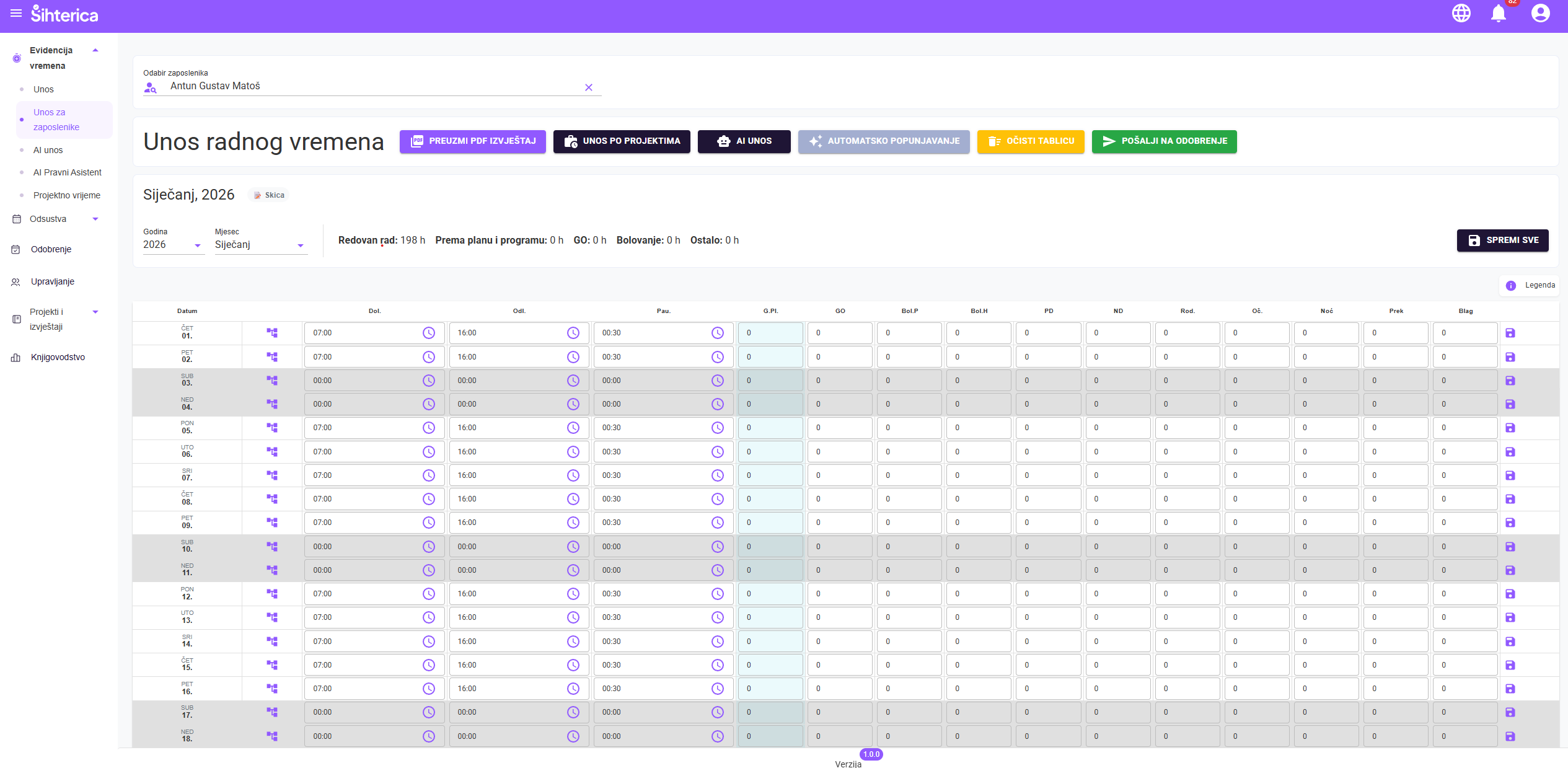 Detaljan uvid u evidencije odabranog zaposlenika. Možete pregledati, unijeti nove podatke ili ispraviti postojeće unose u ime zaposlenika.