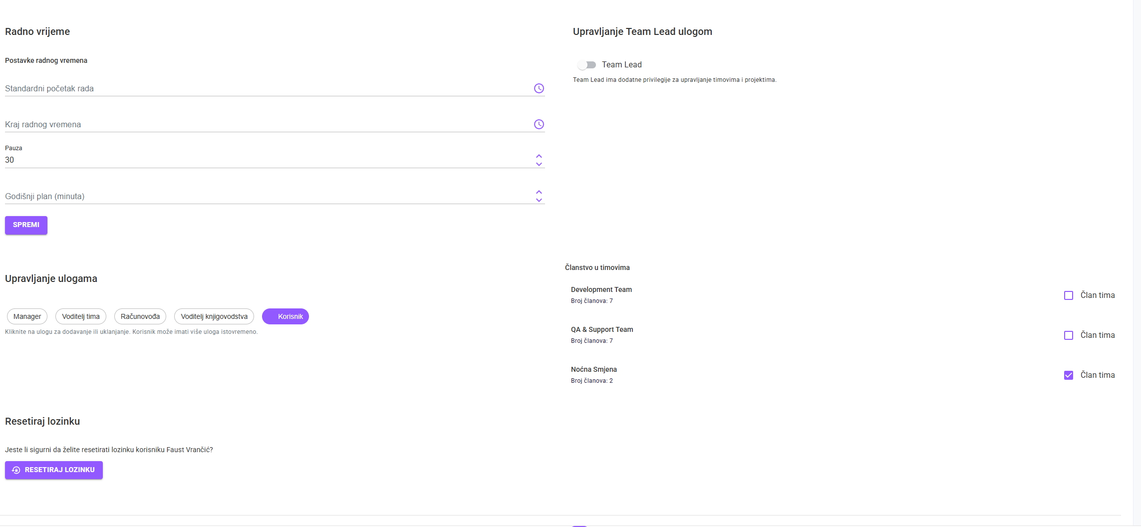 Definirajte standardno radno vrijeme za svakog zaposlenika, organizirajte ih u timove i dodijelite odgovarajuće uloge. Fleksibilna konfiguracija prilagođena vašoj organizacijskoj strukturi.