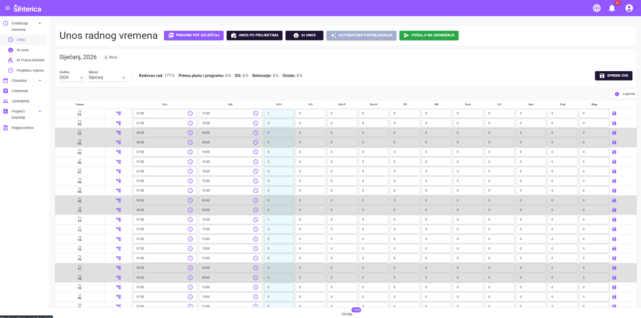 Sve evidencije u formatu spremnom za računovodstvo. Izvezite podatke u Excel ili PDF, filtrirajte po razdoblju i osigurajte točnost podataka za obračun plaća.